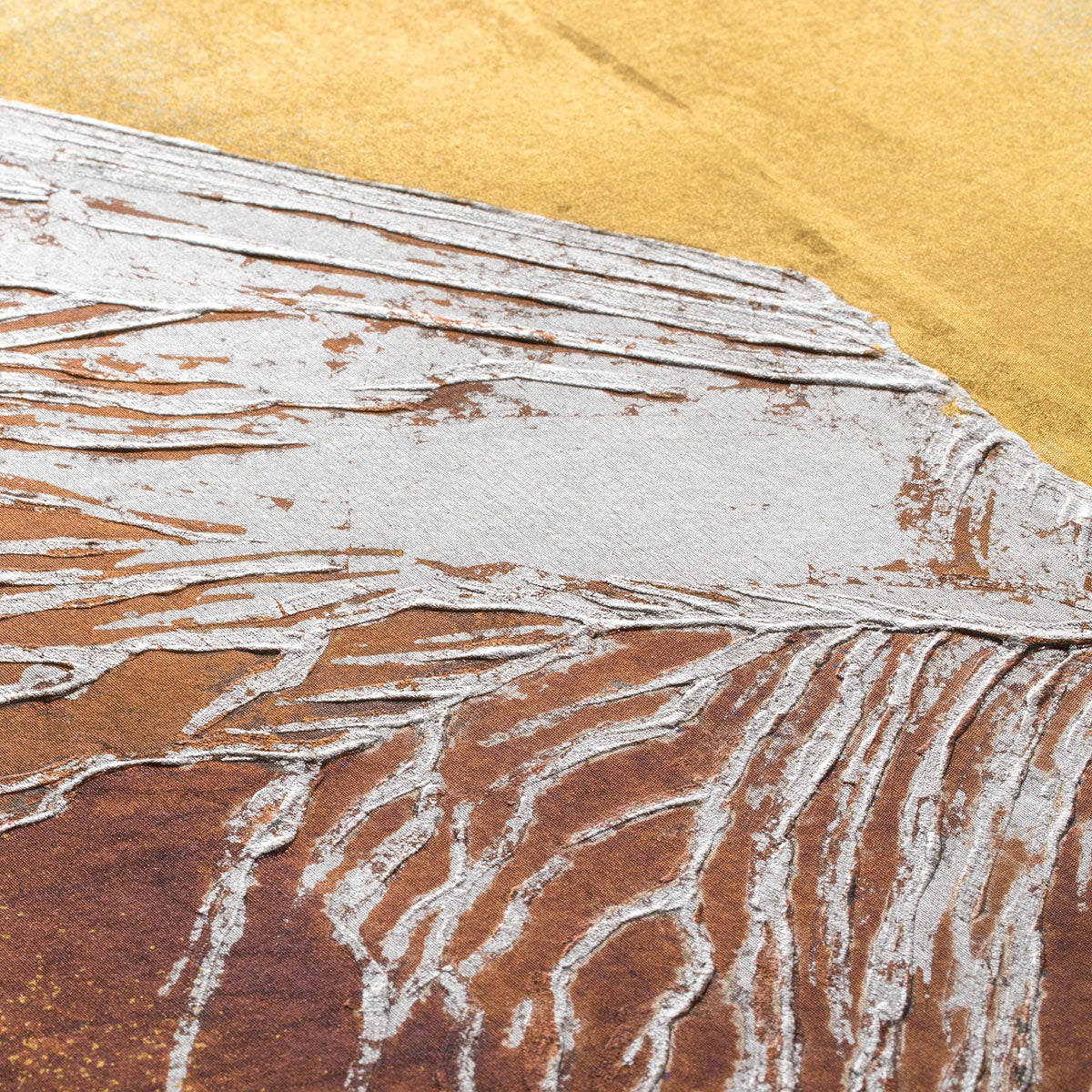 This piece features the hand-painted, three-dimensional "gold leaf raising technique," which creates a distinctive shine and shadows that cannot be replicated with other materials. The luster and texture of the material are enhanced by carefully adjusting the oxidation of the brass foil, fully bringing out its beauty.